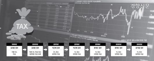 상장주식 양도차익 과세의 역사는 1999년으로 거슬러 올라간다. 대기업 2세들의 변칙 상속 논란에 대응해 대주주만을 대상으로 핀셋 과세가 시작됐다. 대주주 과세 기준은 김대중 정부 때인 2000년 한 종목당 100억원 이상 보유에서 박근혜 정부 시기인 2013년 50억원 이상, 2016년엔 25억원 이상으로, 문재인 정부 때인 2018년 15억원 이상, 2020년 10억원 이상으로 점차 강화됐다. 윤석열 정부는 2023년 기준을 50억원으로 완화했고, 이재명 정부는 이를 다시 10억원으로 ‘원상복구’하겠다고 했다.