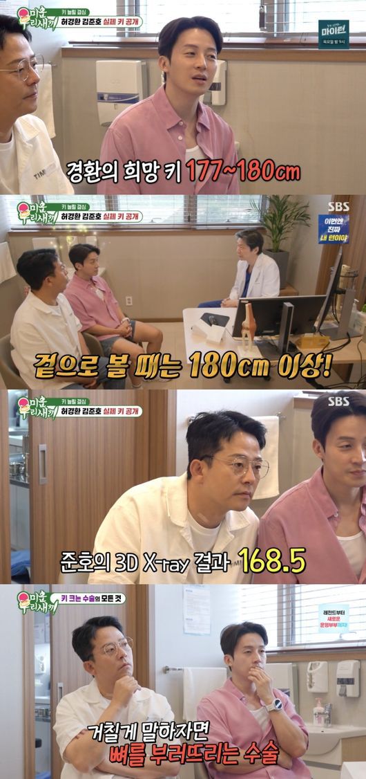 그리고 진행된 상담. 앞서 두 사람은 각종 검사를 했던 바. 엑스레이로 본 실제 키가 공개됐다. 허경환은 168.2cm로 하체 비율은 한국 평균보다 좀 짧은 편이었다. 이를 들은 허경환은 “지금 너무 충격이 크다”라고 했고, 김준호는 “숏다리란 소리네요”라고 못 박아 웃음을 자아냈다.