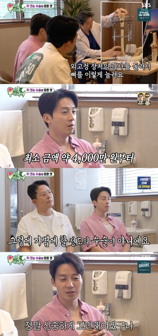 옆에서 진지하게 듣던 김준호는 “만약에 나도 오늘 너를 지켜보고 네가 수술해서 멀쩡하면 나도 고민해봐야겠다. 50살까지 169cm로 살았지만 175cm로 살아보고 싶다”라고 말했다.