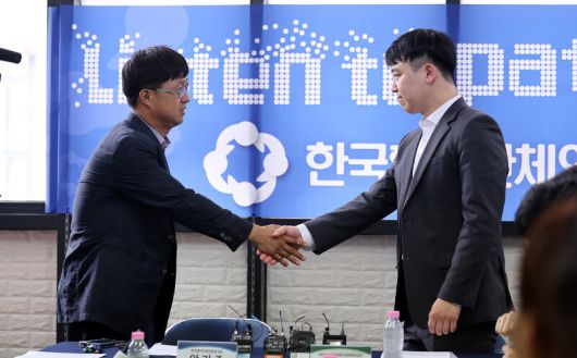 한성존 대한전공의협의회 비상대책위원장(오른쪽)이 지난달 28일 서울 영등포구 한국환자단체연합회를 찾아 안기종 한국환자단체연합회 대표와 인사를 나누고 있다. 전공의와 환자단체가 대면해 대화한 것은 의-정 갈등이 시작된 지 1년5개월 만이다. 이날 참석한 한성존 대전협 비대위원장은 머리발언에서 “1년5개월 이상 길어진 의-정 갈등으로 인해 불편을 겪고 불안하셨을 국민에게 사과의 말씀을 드린다”고 밝혔다. 공동취재사진