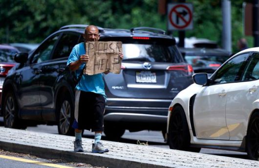 한 남성이 지난달 25일 미국 워싱턴에서 '도와주세요'라고 쓰인 종이를 들고 걸어가고 있다. 워싱턴=AFP 연합뉴스 |