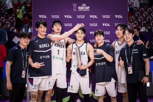 강호 레바논을 11점 차로 제압하고 8강 진출전에 올라간 한국 남자농구 대표팀. 가운데 유기상이 MVP 트로피를 들고 기뻐하고 있다. 사진=FIBA |