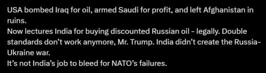 한 인도인은 미국이 인도가 러시아산 석유를 합법적으로 구매하는 것에 대해서 지적을 하고 있는데 이것은 이중 잣대다라고 비판을 했는데요. 이런 비판하는 글들이 굉장히 많이 확산이 되고 있습니다.