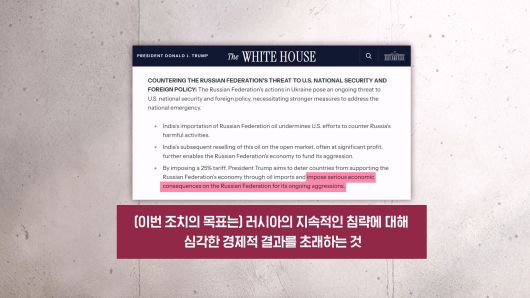 이에 대한 백악관의 설명은 이렇습니다. 인도가 러시아 원유를 수입을 함으로써 "러시아의 해로운 활동에 대응을 하려는 미국의 노력이 훼손되었다"라고 하면서요. 이번 관세 조치의 목표가 "러시아의 지속적인 침략, 즉, 우크라이나에 대한 러시아의 공격에 대해서 심각한 경제적 결과를 초래하는 것이다"라고 했습니다.