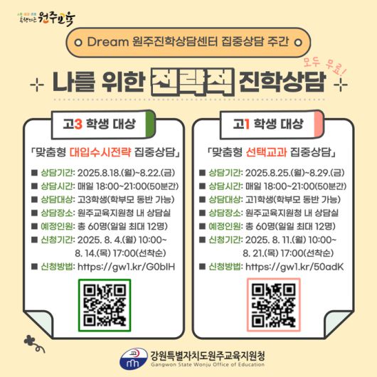 [스포츠서울ㅣ원주=김기원기자]강원특별자치도원주교육지원청(교육장 김성진)은 2025년 8월 18일(월)부터 29일(금)까지 10일간 원주진학상담센터에서 관내 고등학생 120명을 대상으로 ‘2025 드림(Dream) 원주진학상담센터 진로·진학 집중상담 주간’을 운영한다.