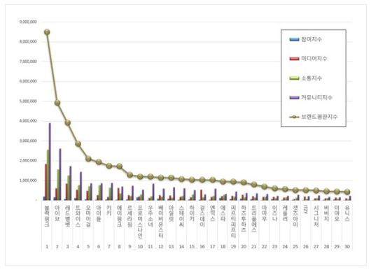 2위, 아이브 ( 안유진, 가을, 레이, 장원영, 리즈, 이서 ) 브랜드는 참여지수 157,148 미디어지수 618,614 소통지수 1,559,956 커뮤니티지수 2,607,002가 되면서 브랜드평판지수 4,942,720으로 분석됐다. 지난 7월 브랜드평판지수 5,091,757과 비교해보면 2.93% 하락했다.