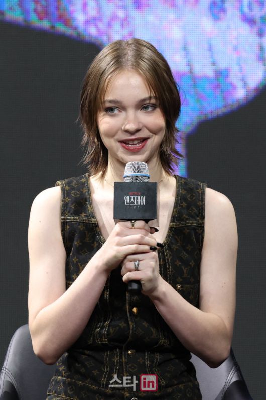[이데일리 스타in 이영훈 기자] 배우 에마 마이어스가 11일 오전 서울 중구 포시즌스 호텔 서울에서 열린 넷플릭스 시리즈 '웬즈데이' 시즌2 내한 기자간담회에서 취재진에게 인사하고 있다.