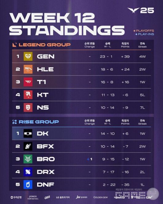 하위권에서는 디플러스 기아가 DN 프릭스를 2대0으로 제압하며 플레이-인 진출을 확정했고, DN 프릭스는 2승 22패로 플레이오프 진출 희망이 완전히 꺾였다.