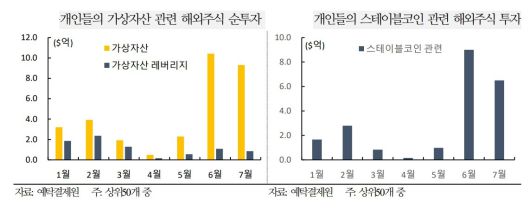 지난 1월 8.5%에 그쳤던 가상자산 주식 투자비즁은 6월 36.5%, 7월 31.4% 등으로 30%를 웃돌았다. 특히 지난 6월 스테이블코인 시가총액 2위 USDC(서클) 발행사인 서클 인터넷은 순매수 1위를 기록했고, 7월에도 상위 10개 순매수 종목 중 5개가 코인베이스 등 가상자산 거래소나 비트마인 등 이더리움 보유 기업이어서 눈길을 끌었다.