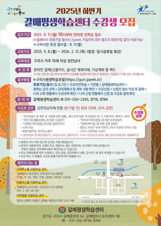 (구리=국제뉴스) 임병권 기자 = 구리시는 11일부터 온라인을 통해 구리시평생학습관과 갈매평생학습센터, 수택평생학습센터의 2025년 하반기 강좌 수강생을 선착순 모집한다.