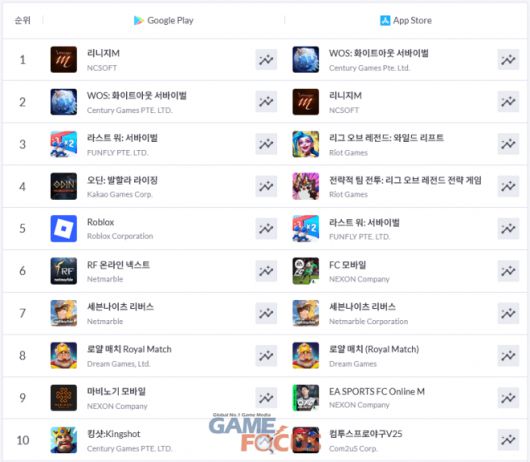 구글 플레이에서는 TOP 5에 큰 변화가 없다. '리니지M'이 1위를 수성하는 한편, '화이트아웃 서바이벌'과 '라스트 워: 서바이벌', '오딘: 발할라 라이징', '로블록스'가 그 뒤를 이으며 TOP 5를 형성하고 있다.
