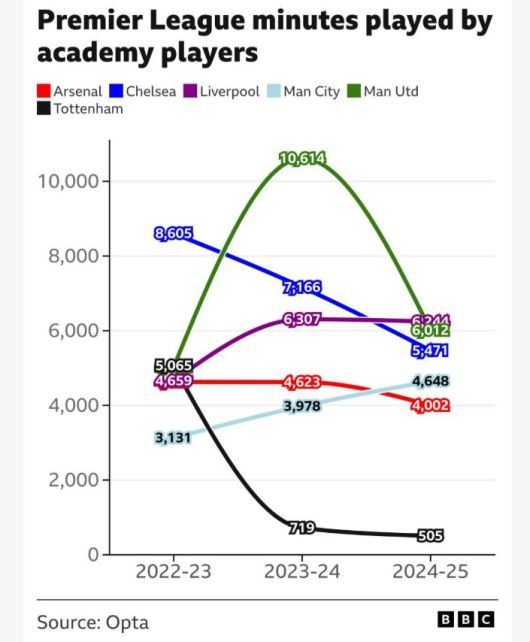 영국 공영방송 'BBC'는 10일(한국시간) "토트넘 홋스퍼는 프리미어리그 빅6(토트넘, 리버풀, 아스날, 맨체스터 유나이티드, 맨체스터 시티, 첼시)팀 중 지난 2시즌 동안 가장 적은 출전 시간을 부여한 팀이다"라고 전했다. BBC가 함께 제공한 출전 시간 그래프를 살펴보면, 토트넘은 2023-24시즌에 719분, 2024-25시즌에는 505분의 출전 시간을 아카데미 선수들에게 제공했다.