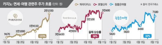 코스피 지수가 횡보할 수 있다는 우려가 커지는 가운데 카지노 등 중국인 소비 관련주는 양호한 성적을 내고 있다. 다음 달부터 재개되는 중국인 단체관광객 무비자 입국의 수혜를 볼 것이라는 기대감이 반영된 것으로 보인다.