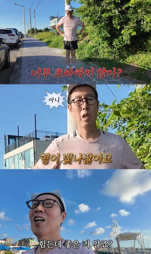러닝에 앞서 옷을 갖춰입은 김영철은 "나 한 번 봐봐. 너무 초라하지 않아?"라고 물었는데, 그의 지인은 "형이 빛나잖아요"라고 말했다.