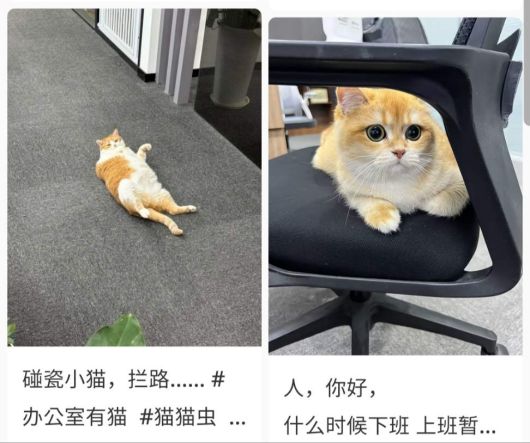 중국 선전의 한 무역회사에서 일하는 타오모씨의 샤오훙슈에는 매일 고양이 두 마리 사진이 올라온다. 검은색, 갈색 고양이들 모습 뒤로 사무실 책상이나 복사기, 회의실 칠판 등이 보인다.