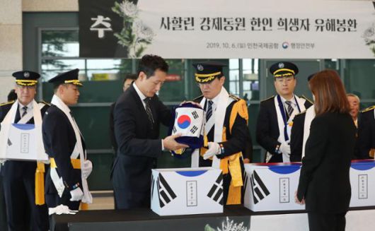 사할린 강제동원 한인희생자 유해 14위가 2019년 10월 6일 인천국제공항을 통해 봉환되고 있다. 사진은 기사 내용과 무관하다. 영종도=연합뉴스 |