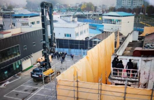 철거 작업 중인 아카데미극장 건물 4층에 연결된 야외 난간뜰에서 고공 농성을 벌이는 시민들의 모습. 아카데미의 친구들 범시민연대 제공 |
