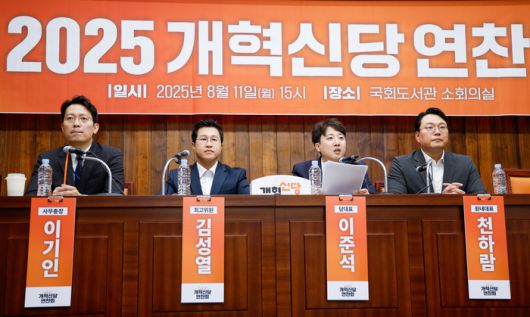 이준석 개혁신당 대표를 비롯한 개혁신당 신임 지도부가 11일 서울 여의도 국회도서관에서 3기 지도부 언론인 연찬회 인사말을 하고 있다. [사진출처=뉴스1] |