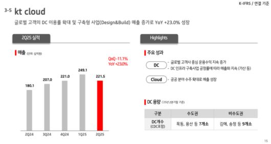KT클라우드는 DC 부문에서 글로벌 고객사를 중심으로 한 운용수익이 지속 증가하고 있으며, 가산 등 DC 인프라 구축사업의 공정률에 따른 매출화도 꾸준히 진행되고 있다. 클라우드 부문에서는 공공 분야 수주 확대로 매출이 성장했다.