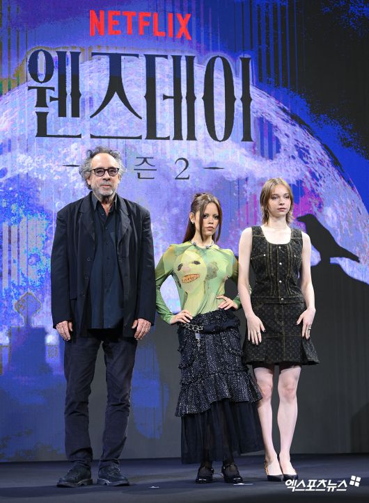 11일 오전 서울 종로구 포시즌즈 호텔 서울 그랜드볼룸에서 넷플릭스 시리즈 '웬즈데이' 시즌2 기자간담회가 진행됐다. 이날 팀 버튼 감독과 배우 제나 오르테가, 에마 마이어스가 참석했다.