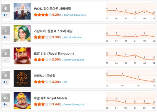 그 외 상위권에서는 ‘로얄킹덤’, ‘WOS: 화이트아웃 서바이벌’, ‘가십하버: 합성&스토리 게임’, ‘로얄매치’ 등이 나란히 한두 계단씩 하락했다. 한때 상승세를 타며 4위까지 올랐던 ‘마비노기 모바일’은 이번 주 9위로 내려앉았다.
