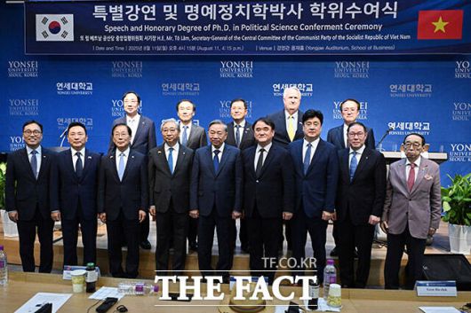 [더팩트ㅣ남용희 기자] 조현상 HS효성 부회장이 11일 오후 서울 서대문구 연세대학교에서 열린 또 럼 베트남 서기장의 특별강연 및 명예정치학박사 학위수여식에 참석하고 있다.