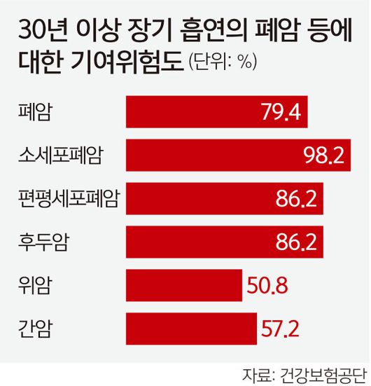 ‘30년 이상, 20갑년 이상’ 흡연자의 암 발생위험도는 비흡연자에 비해 소세포폐암의 경우 54.5배, 편평세포폐암 21.4배, 편평세포후두암 8.3배 높았다. 1갑년은 하루에 1갑을 피우는 양이다.