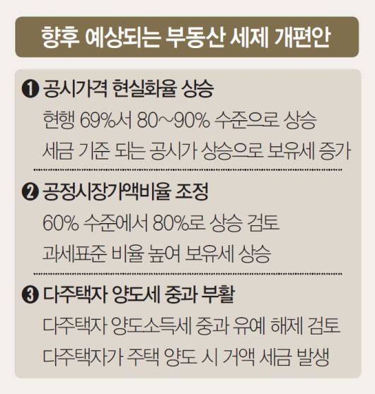 이재명정부의 세제 개편안으로 증시가 어지러운 가운데, 부동산 시장에도 전운이 감돈다. 정부의 다음 타깃이 ‘부동산세’라는 예측이 나오면서다. 주택 공급 부족으로 내년 집값이 반등할 것이란 전망이 나오자, 당정은 ‘부동산세 개편’ 카드를 만지작거리는 모습이다. 시장에서는 종합부동산세 공정시장가액비율 상향, 공시가격 현실화율 제고, 다주택자 양도소득세 중과 등의 조치가 거론된다. 강력한 대출 규제 방안을 담은 6·27 대책으로 주택 시장이 얼어붙은 상황에서 세제 개편까지 이뤄지면 투자자 혼란은 가중될 전망이다.