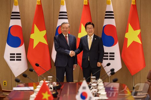 이재명 대통령과 또 럼 베트남 당서기장이 11일 서울 용산 대통령실 청사에서 열린 한·베트남 확대정상회담에서 기념촬영을 하고 있다. (대통령실 제공. 재판매 및 DB금지) 2025.8.11/뉴스1 ⓒ News1 이재명 기자 |