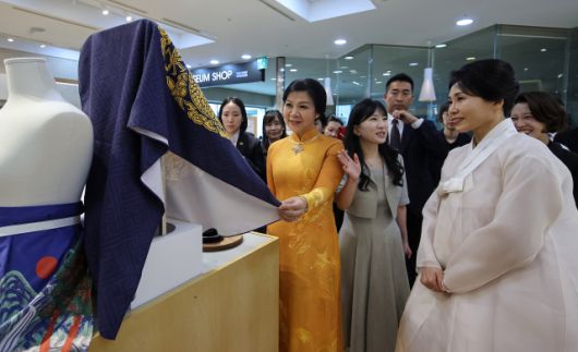 김 여사는 11일 오전 10시 30분께 서울 용산구 국립중앙박물관에서 리 여사를 맞이했다. 김 여사는 고운 분홍빛 한복을, 리 여사는 베트남 전통의상인 황금빛 아오자이를 입고 박물관에 들어섰다.