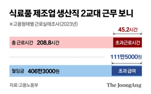 식품업계에선 업종 특성상 근무조를 늘리기 어려운 면이 있다고 주장한다. 한 식품업체 관계자는 “제한된 시간 내에 주문량을 최대한 맞추기 위해 가장 효율적인 근무 방식”이라고 말했다. 다른 식품사 관계자는 “빵 등 신선 식품은 짧은 유통기한 등을 고려해야 해 2조 2교대가 불가피한 측면이 있다”라고도 했다. 김승택 한국노동연구원 연구위원은 “임금이 적고, 인력을 확보하기 어려운 기업일 수록 시간당 임금 1.5배를 지급하는 초과 근로제로 작업량 증가에 대응하고 있다”라고 분석했다. 고용노동부의 고용형태별 근로실태조사(2023년)에 따르면 식료품 제조업에 종사하는 2교대 생산직은 월평균 406만3000원을 버는데, 이 중 27.4%가 초과 근로 급여였다. 초과 근무 축소시 임금도 줄 수 있다.