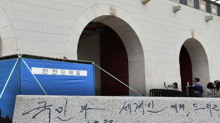 오전 8시 10분쯤 한 남성이 광화문에 있는 3개의 홍예문 가운데 좌측과 중앙 사이에 있는 네모난 돌에 검은 매직으로 쓴 겁니다.