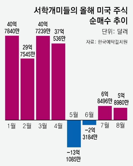 미국 증시에 투자하는 ‘서학 개미’들이 다시 미국 주식과 채권을 사들이고 있다. 코스피가 3,100∼3,200 선 박스권에 갇힌 기간이 길어지고 세법 개정안 논란까지 터지자 미국으로 다시 눈길을 돌리는 모습이다.