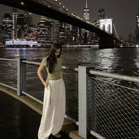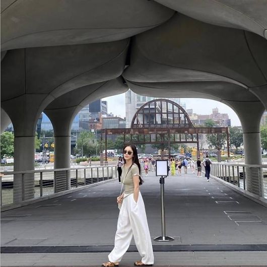 자연스럽게 풀어 내린 긴 생머리와 라운드 선글라스는 여유로운 여름날의 감성을 더하며, 도심 속 휴양지 분위기를 풍겼다. 사진 속 그는 뉴욕 거리를 여유롭게 거닐며 밝은 미소를 지었다.