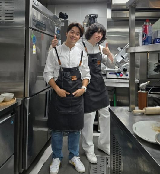 공개된 사진에는 김희철과 함께 앞치마를 두른 허경환이 식당 주방에서 카메라를 바라보며 미소 짓고 있는 모습이 담겨 있다.