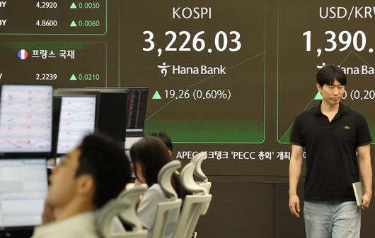 12일 서울 중구 하나은행 딜링룸 스크린에 코스피와 환율이 표시돼 있다. 이날 코스피 지수는 전장보다 2.98포인트(0.09%) 오른 3,209.75로 출발했다. /연합뉴스 |