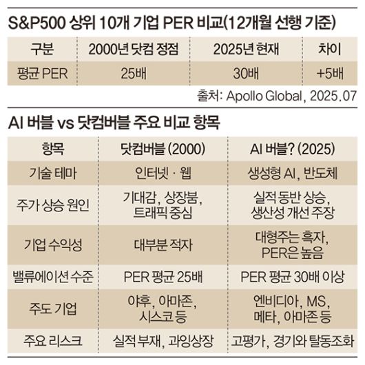 지금은 다를까. 토르스텐 슬록 아폴로글로벌 수석 이코노미스트는 “현재 S&P500 상위 10개 기업의 12개월 선행 PER은 30배에 육박한다”며 “이는 2000년 닷컴 정점 당시의 25배보다도 높은 수준”이라고 지적한다. 그는 “AI 기업들에 대한 과도한 기대가 현실을 앞질렀다”며 “이번 랠리는 기술적 거품이자, 역사상 가장 고평가된 시장 중 하나”라고 평가했다.