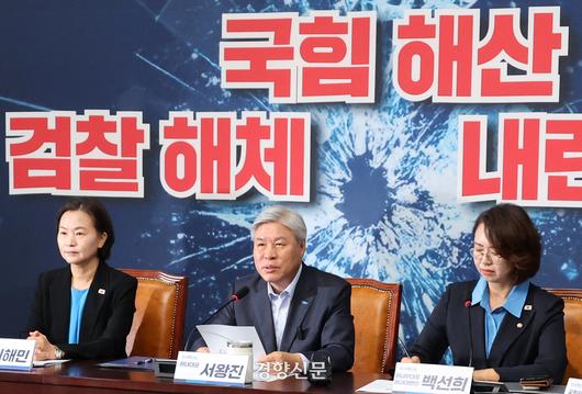 ‘내란 완전 종식’도 내걸었다. 서 원내대표는 “윤석열 검찰독재 정권을 조기 종식했던 조국의 기치를 내란세력 완전 청산으로 이어가야 한다”며 특검법 개정, 여당과 진보 야4당이 합의했던 ‘반헌특위(반헌법행위 특별조사위원회)’ 출범 등을 촉구했다.