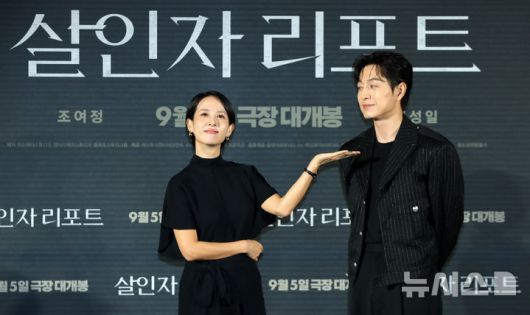 [서울=뉴시스] 김혜진 기자 = 배우 조여정(왼쪽), 정성일이 12일 오전 서울 용산구 CGV 용산아이파크몰에서 열린 영화 '살인자 리포트'(감독 조영준) 제작보고회에서 포즈를 취하고 있다. 2025.08.12. jini@newsis.com |