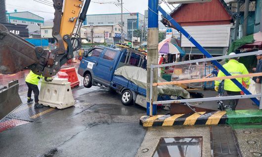 부산 사상구 감전동 새벽시장 앞 도로에 발생한 싱크홀에 빠진 1t 트럭을 굴착기를 이용해 구조하고 있다. 부산소방재난본부 제공 |