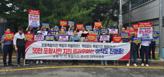 포항11.15촉발지진 범시민대책위원회(이하 범대위)는 12일 대구지방법원 포항지원 앞에서 집회를 열고, 포항지진의 철저한 진상 규명과 책임자 처벌을 촉구했다.