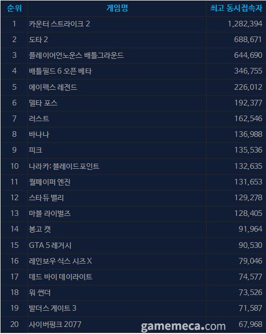 ▲ 8월 12일 오후 1시 기준 스팀 일 최고 동시접속자 TOP 20 (자료출처: 스팀) |