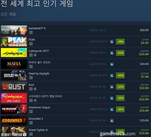 그 외 스팀 전 세계 최고 인기 게임에서는 테스트가 끝났음에도 배틀필드 6가 1위를 유지하고 있다. 이어 지난 4월 앞서 해보기를 시작했던 로그라이크 FPS 데드존: 로그가 정식 출시와 함께 8위를 차지했다.