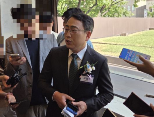유영상 SK텔레콤 대표가 12일 '정부-이통사 AI 투자협력 선언식'을 마치고 기자들과 대화하는 모습. /사진=윤지혜 기자 |
