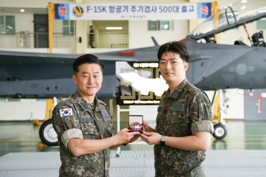 류기필 제11전투비행단장(왼쪽)이 이혁주 검사중대장에게 F-15K 주기검사 500대 달성 기념 코인을 전달하고 있다. 제11비 제공 |