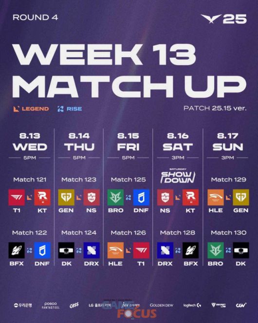 레전드 그룹에서는 젠지, 한화생명e스포츠, T1이 이미 플레이오프 진출을 확정한 가운데, 남은 플레이오프 티켓은 단 한 장뿐이다. 4위 kt 롤스터(11승 13패)와 5위 농심 레드포스(10승 14패)는 16일(토) 열리는 ‘새터데이 쇼다운’에서 맞붙을 예정이며 이 경기에서 kt 롤스터가 승리한다면 남은 한 장을 가져갈 확률을 크게 높일 수 있지만 반대로 농심 레드포스가 이길 경우 두 팀의 순위 경쟁은 이전투구가 될 공산이 크다.