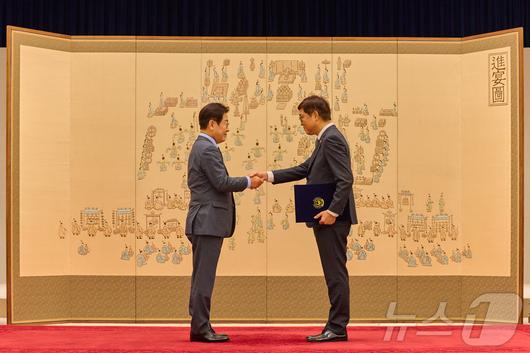 (서울=뉴스1) 이재명 기자 = 이재명 대통령이 12일 서울 용산 대통령실 청사에서 열린 신임 국무위원 임명장 수여식에서 최휘영 문화체육관광부 장관에게 임명장을 수여하고 있다. (대통령실 제공. 재판매 및 DB금지) 2025.8.12/뉴스12expulsion@news1.krCopyright ⓒ 뉴스1. All rights reserved. 무단 전재 및 재배포, AI학습 이용 금지.