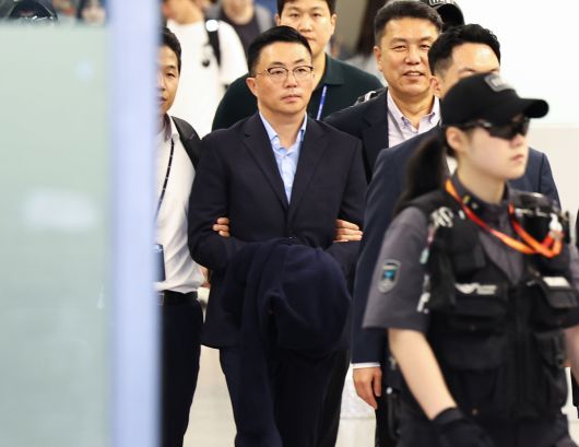 '김건희 집사' 김예성 씨가 12일 인천공항으로 귀국해 체포되어 김건희 특검팀(특별검사 민중기) 사무실로 압송되고 있다. 뉴시스 |
