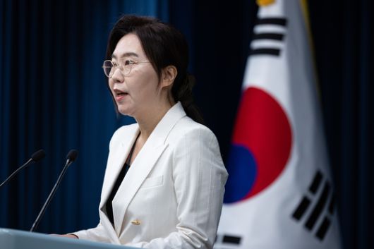 강유정 대통령실 대변인이 12일 서울 용산 대통령실 청사에서 한미 정상회담 개최 관련 브리핑을 하고 있다. 뉴스1 |