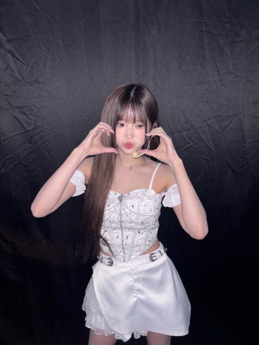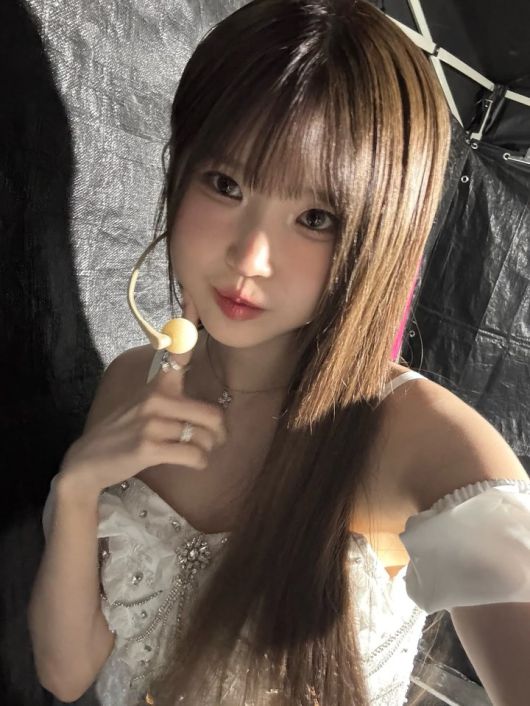 클로즈업된 셀카 속 송하영은 하트 포즈와 함께 미소를 짓고 있다. 깊이 있는 브라운 음영과 속눈썹이 눈매를 또렷하게 잡아주고, 하얀 무대 의상 위 반짝이는 주얼 장식과 네크리스가 포인트가 돼 러블리한 매력을 배가시킨다.